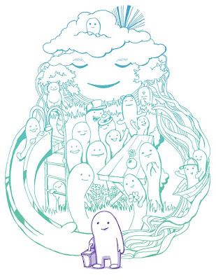 If Thine Eye Offend Thee... is one of the most exciting potential Threadless tees I've seen in a long time. It's all about departure: in some ways it's even a departure for the designer. There's a lot of his trademark style, and I don't think anyone familiar would not be able to tell it was his work, but it feels a lot darker, a lot more industrial, a lot creepier than his often lighthearted work. Then again, it's also a lot darker than a lot of what Threadless itself prints, but it's simply too awesome to go unnoticed. It's incredibly striking, especially since it's limited color palette nevertheless is made up of two perfect colors. The green adds to the toxic, industrialized feel of the piece, creating its own layer of creepiness for the proceedings, and the off-white smoke and drip complements the black and green while also making the "gore" of the image less realistic and more acceptable. The other elements of the design are no less striking, though. The motion in the central act of eye-poking looks as lovely as such an action can look, the pipes and wires and tubes flow wonderfully, but I'm most enthralled by the empty heads. They're haunting, both unsettling and irresistible to look at. They frame the entire scene and scenario in their vacant stares. This is serious awesome, and it simply must see ink.